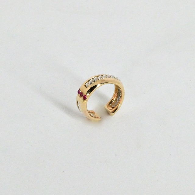 こちらは、rubyを留めたお品物になります。 K10の地金に、シルバーのネジネジをはめ込みました。 ネジネジを分割して、間に石を留めたイヤカフ。 ボリューム感もあり、一つあれば耳元が決まります! シュッとした印象なので、お洋服も選びません。 着用時には石が前を向くようにデザインされているので、 華やかさもあります。 素材:K10 Silver ruby 大きさ:直径14mm 幅5mm 厚み2mm 画像の色味と実物の色味が異なることがありますが、ご了承ください。 画像の商品に、光の色や、映り込みの色がジュエリーに映っております。Philliammのジュエリーは、着色やメッキを一切しておりませんので、画像だけの判断でお手間をお掛け致しますが何卒ご了承くださいませ。 ※装着時の大きな形状変化は、破損に繋がる可能性がありますので、ご注意ください。 オプションのギフトラッピングは御座いませんが、通常仕様で全ての商品に、オリジナルのジュエリーボックスと、ロゴ入りの防水コーティングされた紙袋をお付けしております。 他サイトへの出品の兼ね合いもあり、ご購入頂いた時点で現品がご用意できない場合もありますがご了承ください。欠品の際は、もしお時間頂けるようでしたら、一点もの以外は制作してお届けになります。よろしくお願いいたします。
