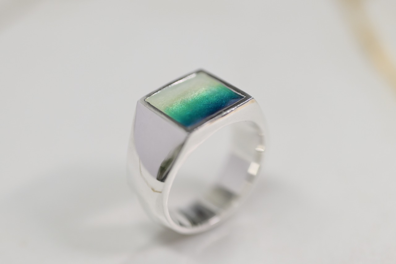 指輪の素材は、七宝の透明感が美しく仕上がるよう、純銀を使用しております。