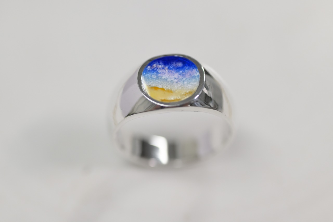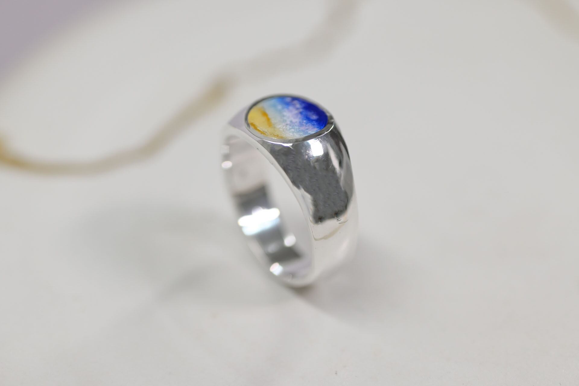 指輪の素材は、七宝の透明感が美しく仕上がるよう、純銀を使用しております。