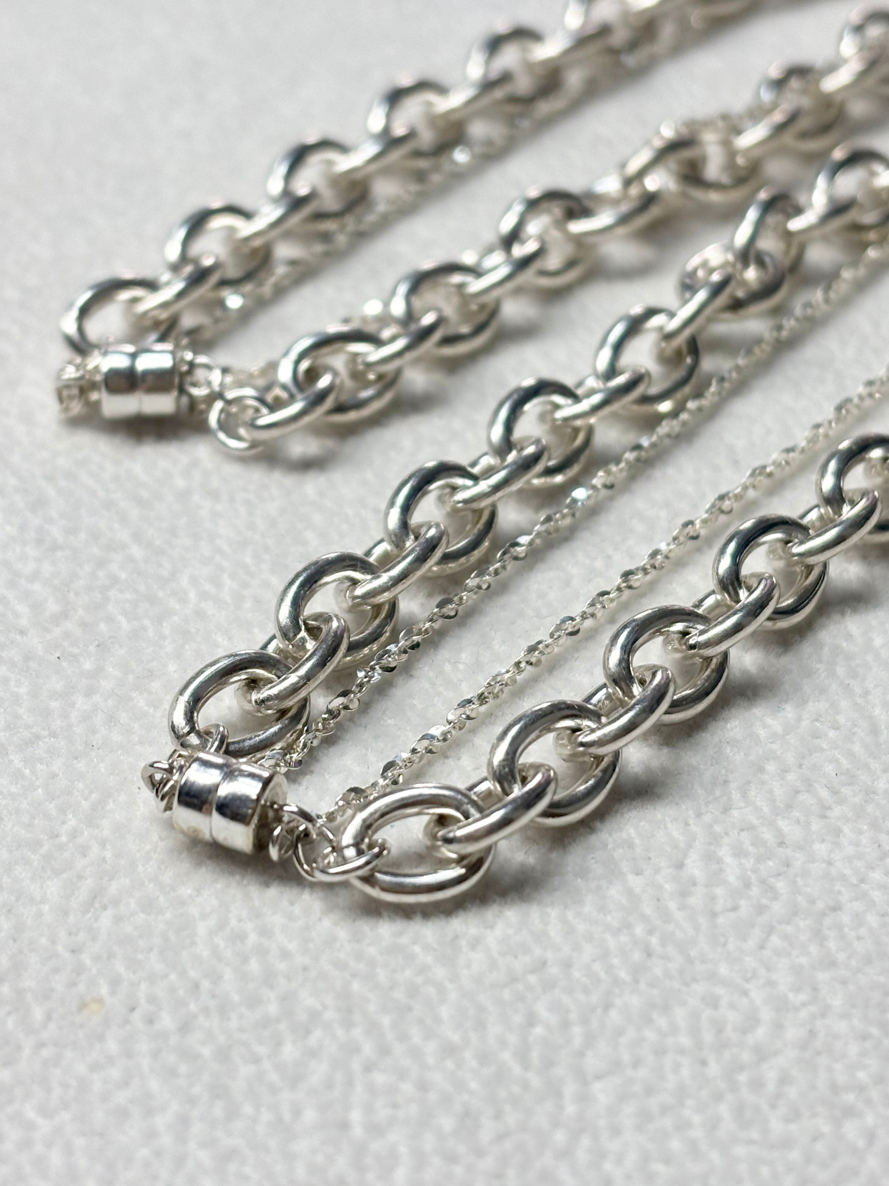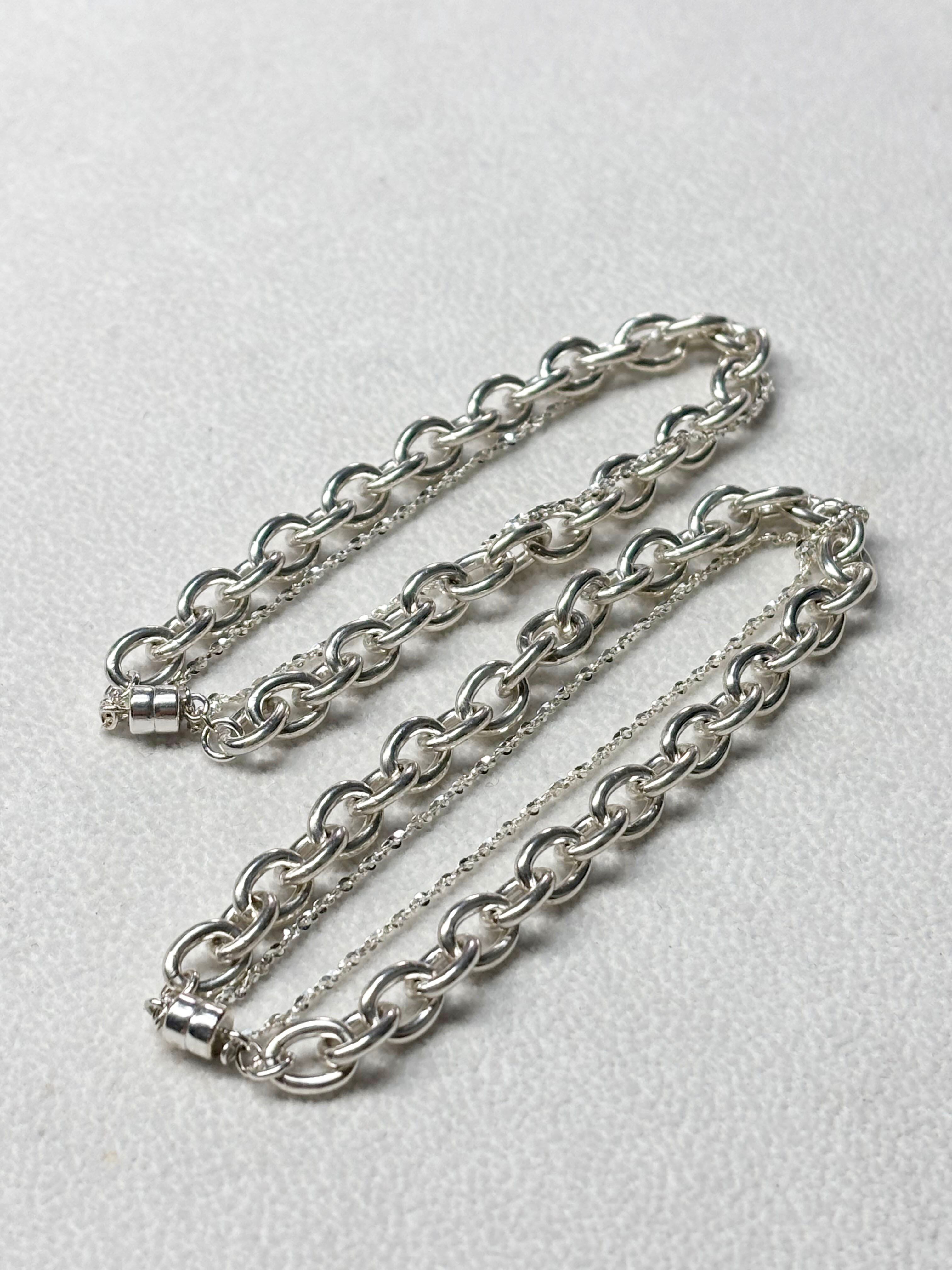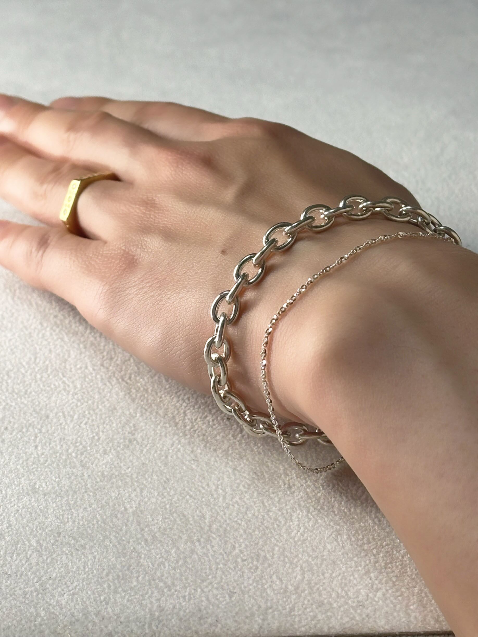 異なる太さのチェーンを巧みに組み合わせたこのブレスレットは、1つのアクセサリーで動きのあるスタイリングを楽しむことができます。
