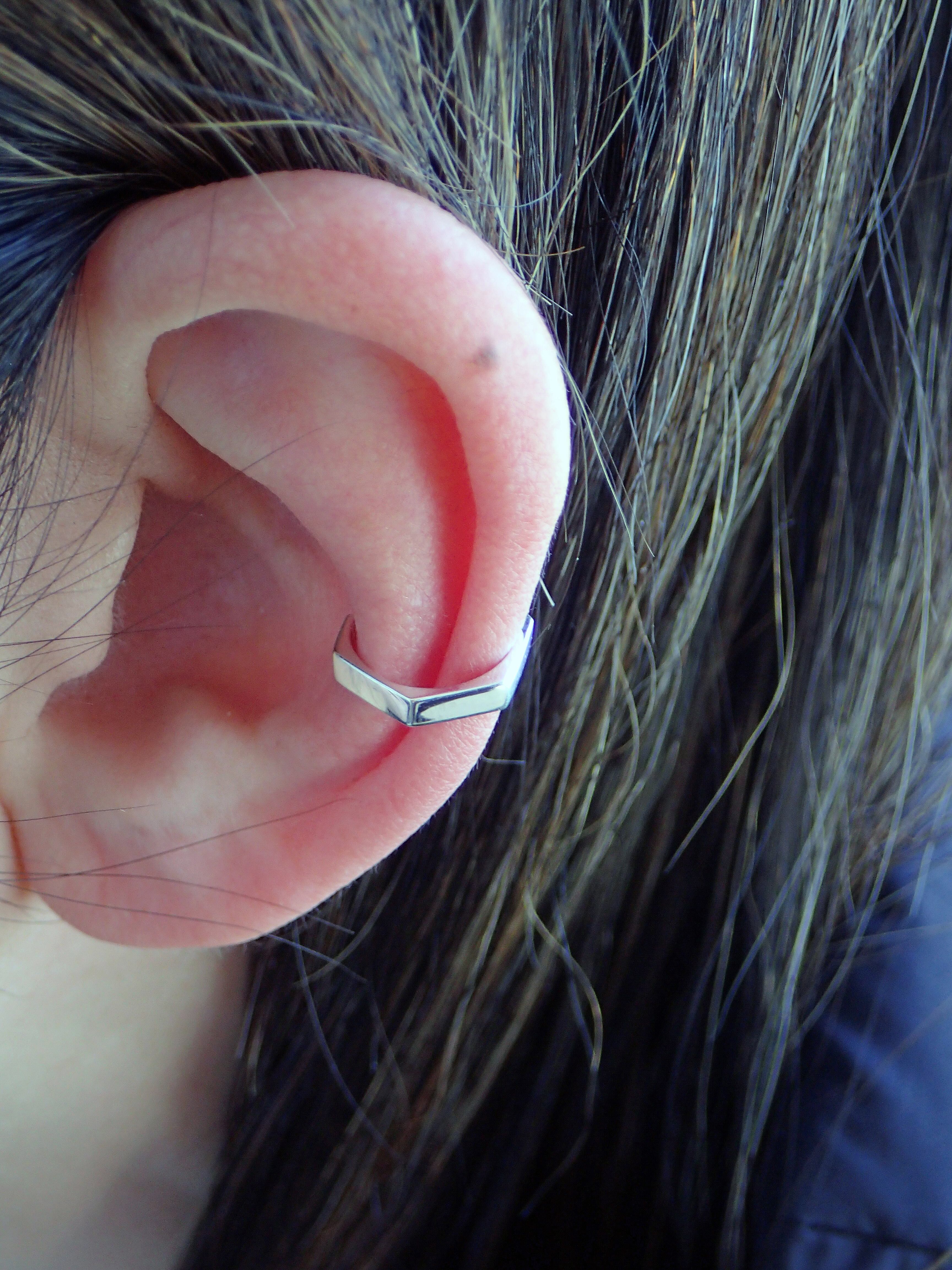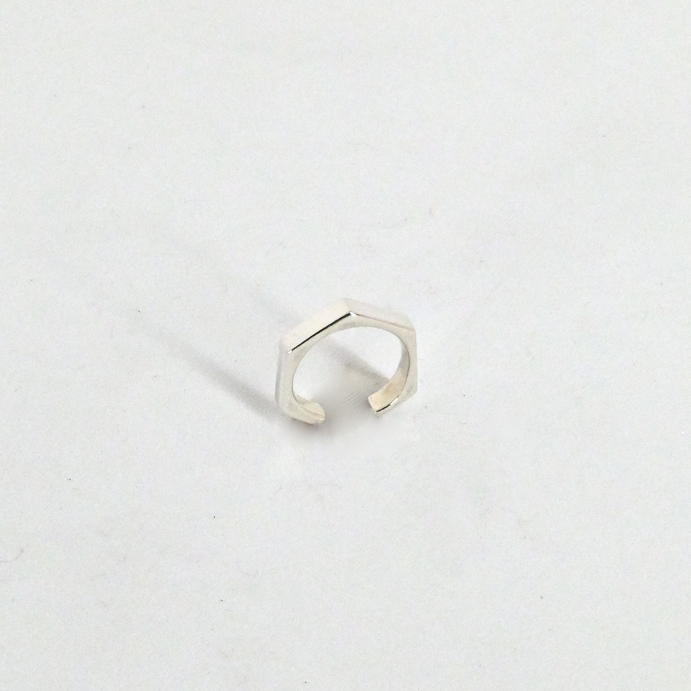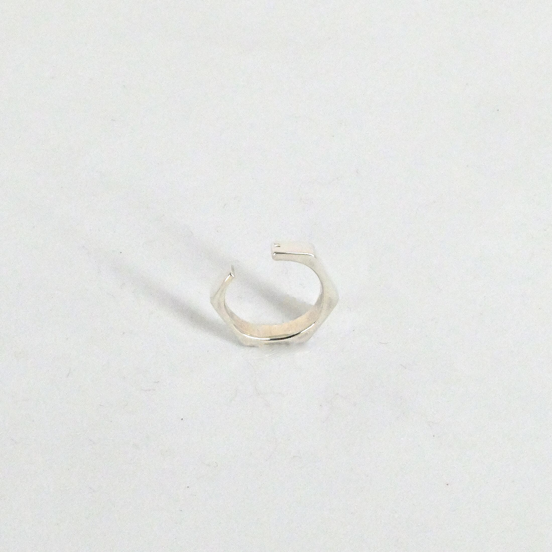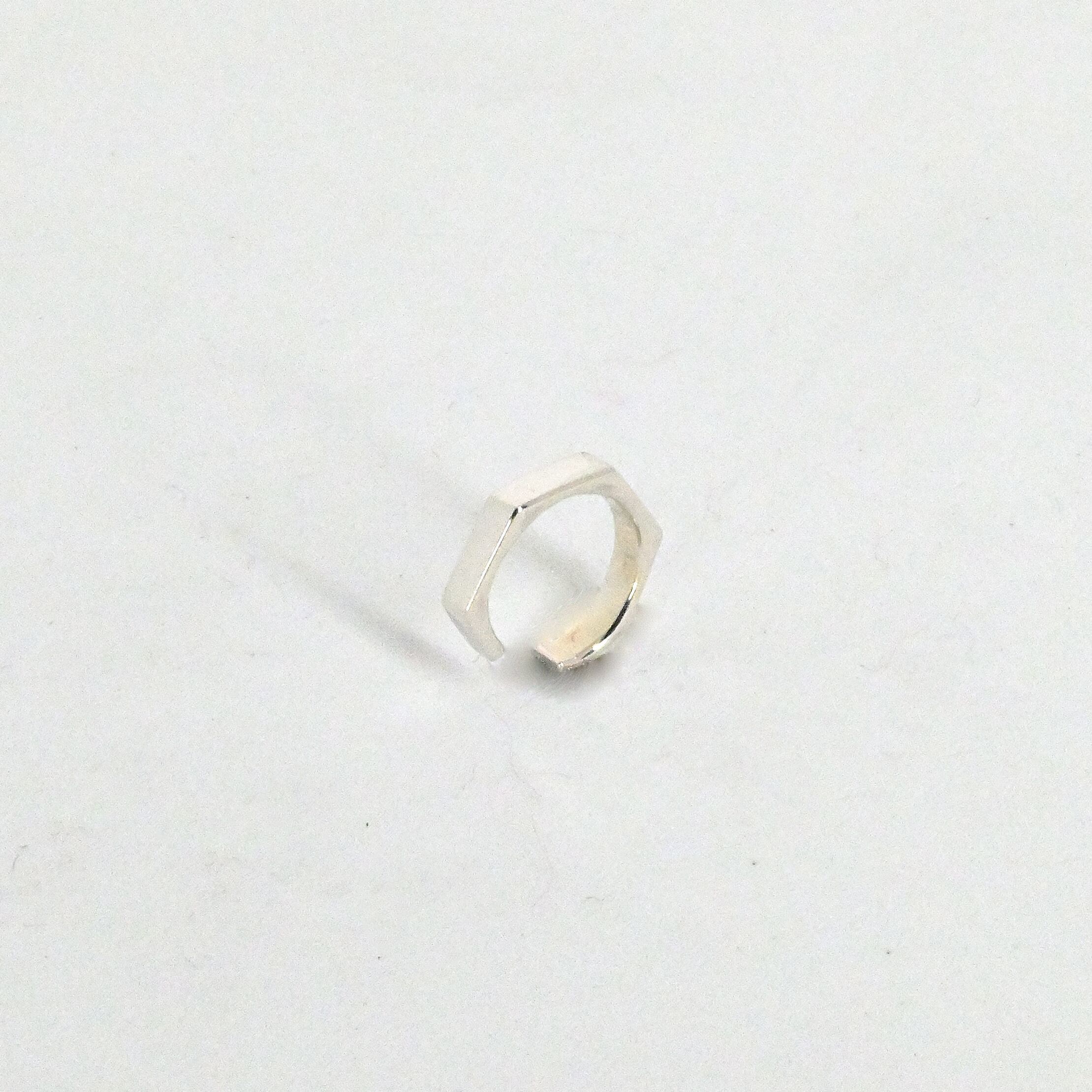 角ばってます。シャキッとしてます。肌に当たる部分、見えないところは角を取ってありますので着け心地は良いですが、外観はカクカクです。甘口コーディネートのアクセントや、辛口コーディネートの後押しに使えます。指輪とセット使い出来ます。