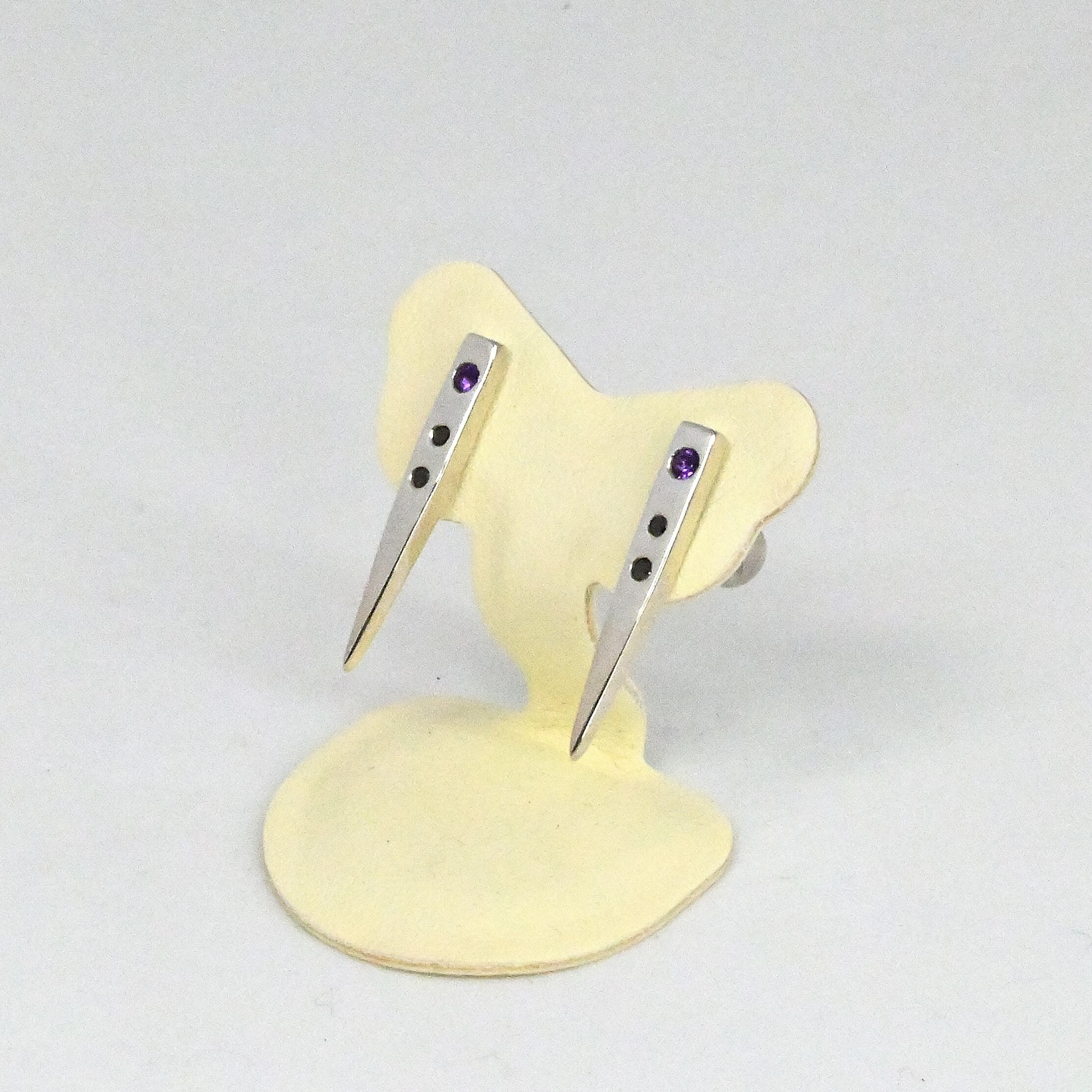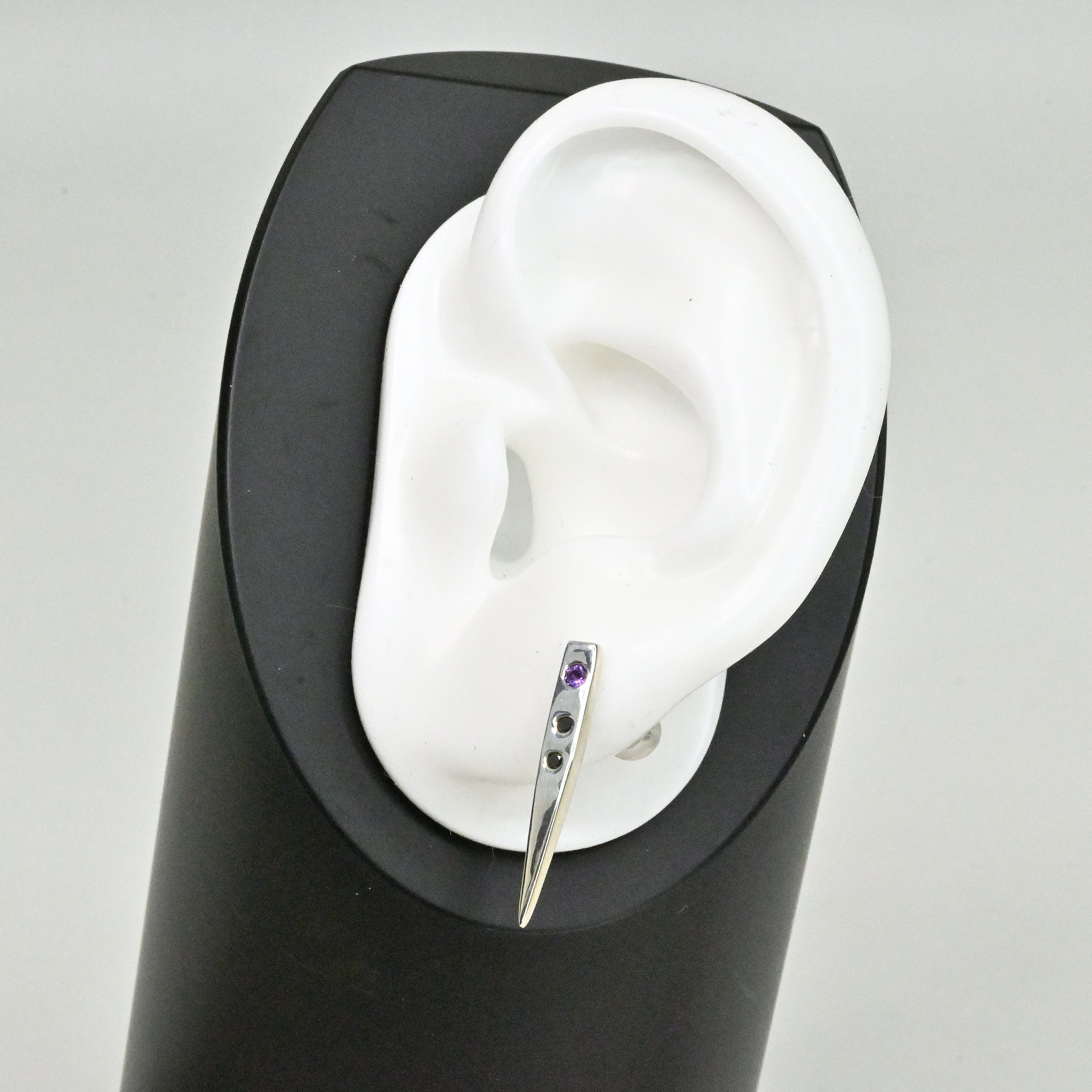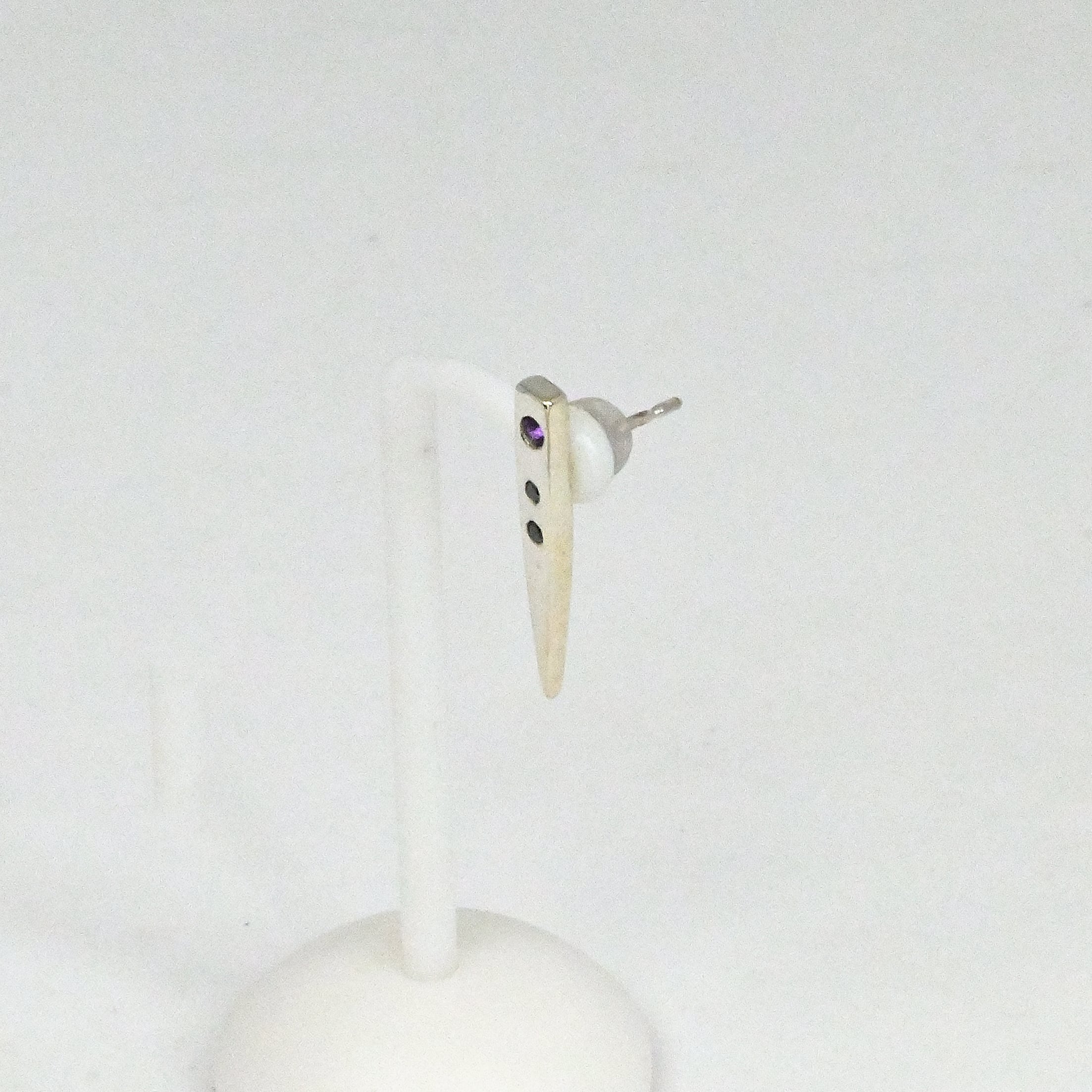 牙をイメージしたピアスにアメシストとブラックダイヤを彫り留めしました。